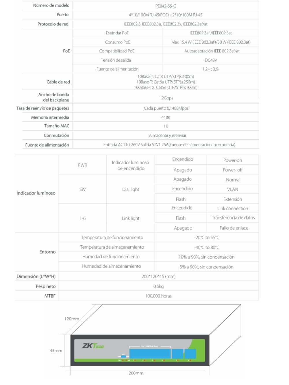 El PE042-55-C es un Switch PoE avanzado que proporciona un punto de red para la transmisión de datos y el suministro eléctrico. Dispone de 4 puertos PoE que pueden suministrar alimentación estándar IEEE802.3af/at a través de cables de red. Gracias al avanzado algoritmo de autodetección para el suministro de alimentación a través de IEEE802.3af/at, el equipo estándar PoE o no PoE conectado está protegido de forma segura y la Fuente de alimentación Entrada AC110-260V Salida 52V1.25A(Fuente de alimentación incorporada).