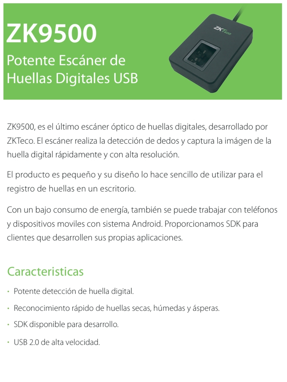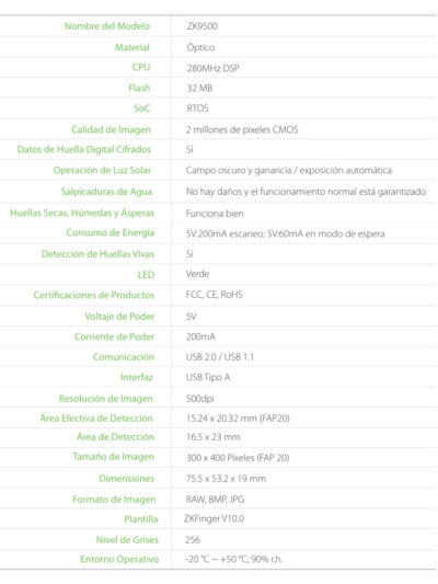 El Enrolador de Huellas Dactilar Digital USB ZK9500, es el último escáner óptico de huellas digitales, desarrollado por ZKTeco. El escáner realiza la detección de dedos y captura la imágen de la huella digital rápidamente y con alta resolución. El producto es pequeño y su diseño lo hace sencillo de utilizar para el registro de huellas en un escritorio. Con un bajo consumo de energía, también se puede trabajar con teléfonos y dispositivos móviles con sistema Android. Proporcionamos SDK para clientes que desarrollen sus propias aplicaciones.