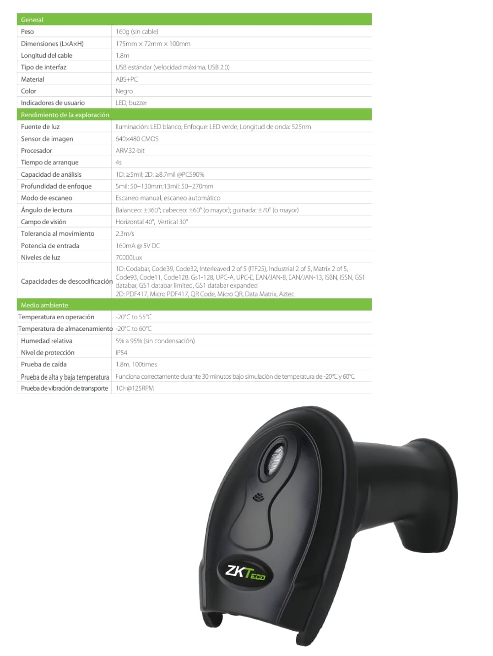 Pistola Escáner de Código de arras 2D ZKB201