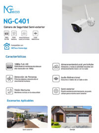 La Cámara WIFi Bala Exterior Full HD NGTeco, para la seguridad de cualquier entorno semi-exterior que le mantendrá siempre informado de lo que ocurre en los lugares de interés. La cámara tipo bala de NGTeco está equipada con un módulo wifi, lo que facilita el cableado en la instalación y la gestión a través de la aplicación móvil de NGTeco Home. Además, la distancia efectiva de 15M de IR y el diseño de 4 LED se asegurarán de que casi todo sea visible incluso en la noche oscura."¡Vigilancia inteligente día y noche! 🌙 Cámara semi-exterior NGTeco NG-C401: Full HD 1080p + visión nocturna 15m. Detecta solo personas (evita falsas alarmas) y habla en tiempo real con audio bidireccional. Resistente a lluvia/calor, almacena en nube o tarjeta 256GB. 🔒 Conexión encriptada y certificaciones internacionales. Instalación WiFi rápida + app de control. ¡Protege tu hogar con tecnología confiable! 👉 ¡Compra hoy con 1 mes de nube GRATIS!"