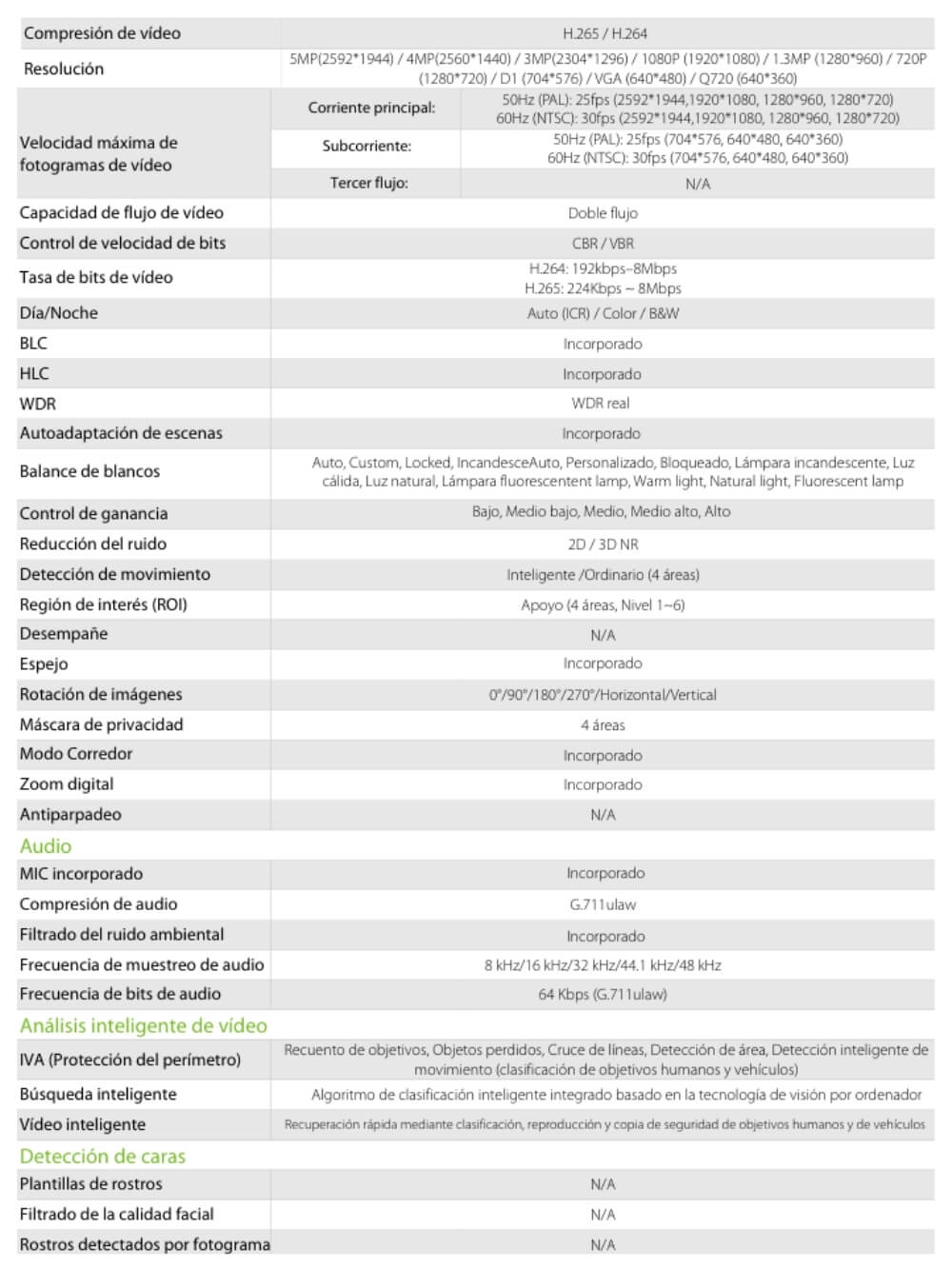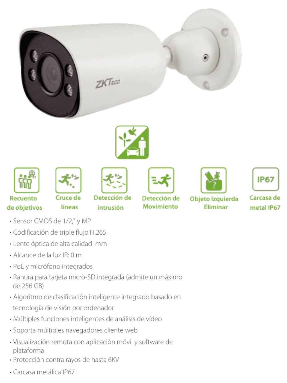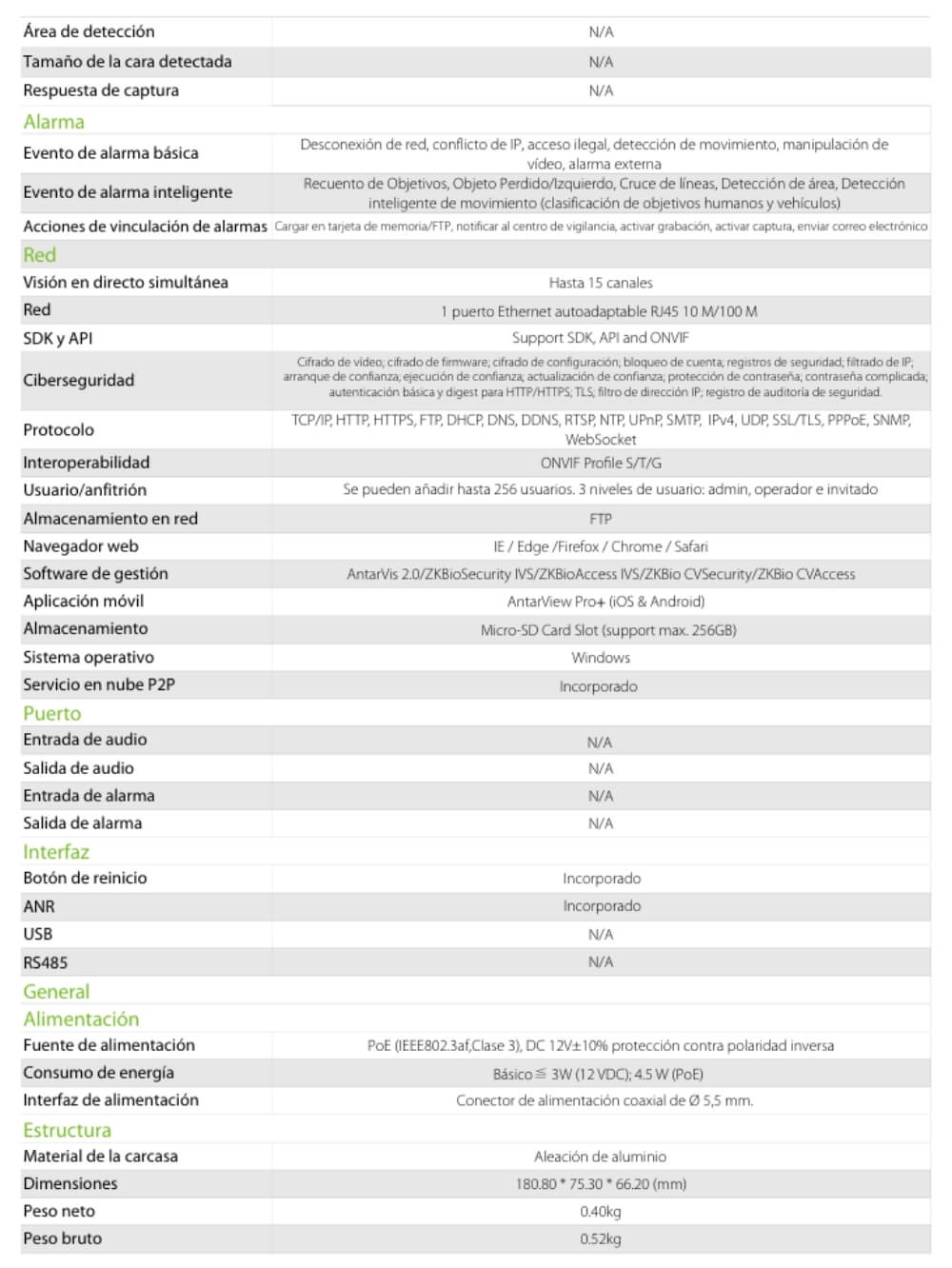 | Tecnologia | Conteo personas/Vehiculos, Cruce de linea, Deteccion vehiculos/personas, Full Color, Intrusion, IP, Objeto perdido/abandonado |