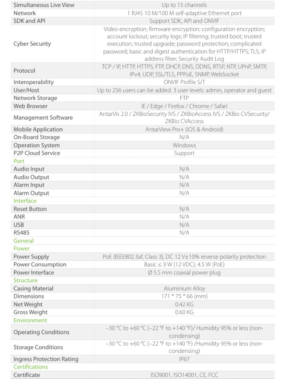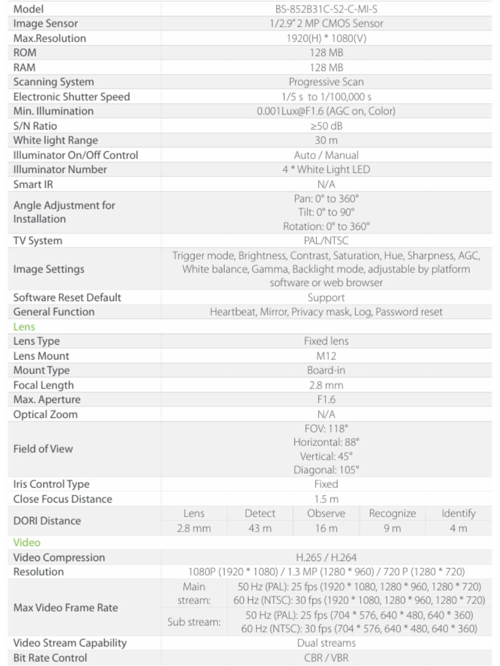 | Tecnologia | Conteo personas/Vehiculos, Cruce de linea, Deteccion vehiculos/personas, Full Color, H.265+, Intrusion, IP, Objeto perdido/abandonado, POE |