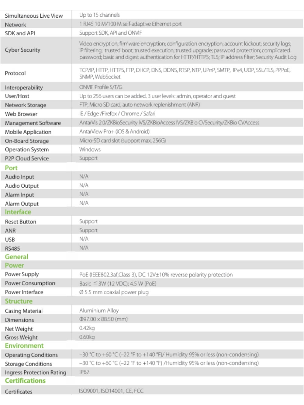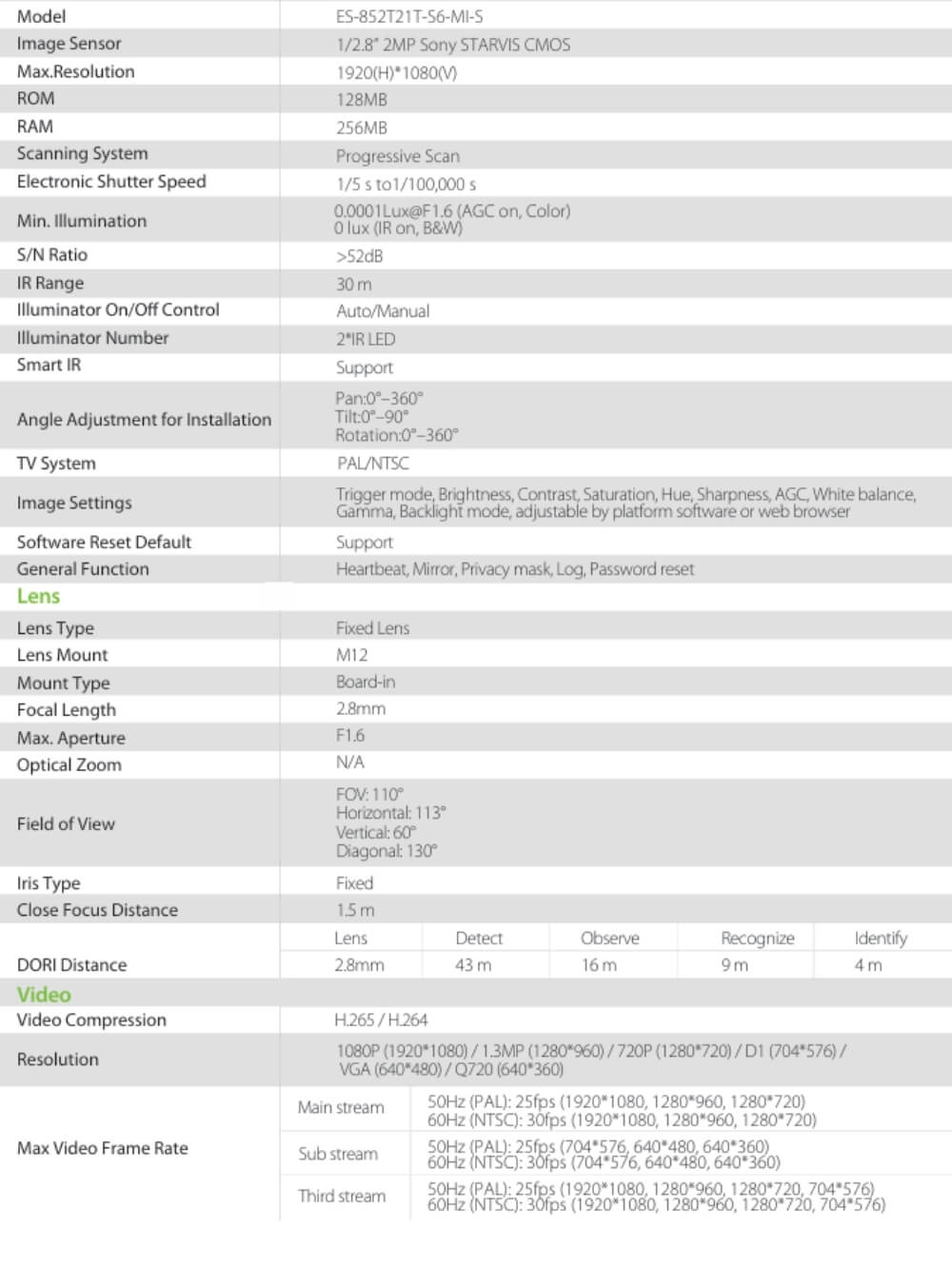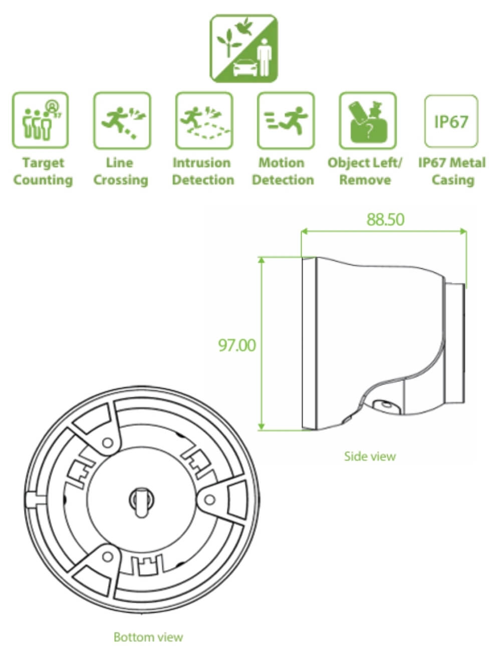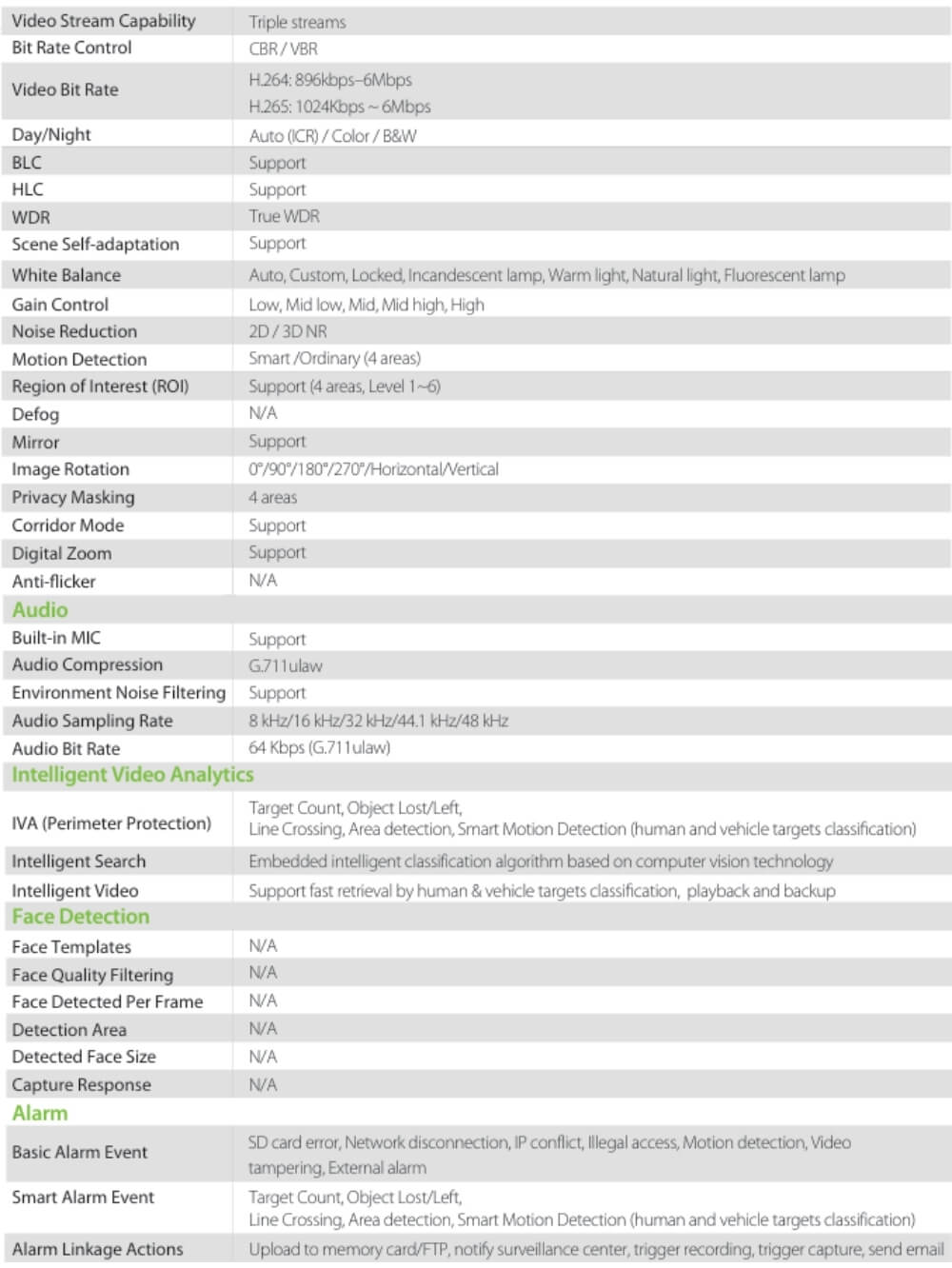 | Tecnologia | Aplicacion, Conteo personas/Vehiculos, Cruce de linea, Deteccion vehiculos/personas, H.265, Intrusion, IP, Objeto perdido/abandonado, POE |