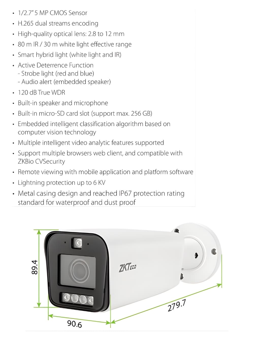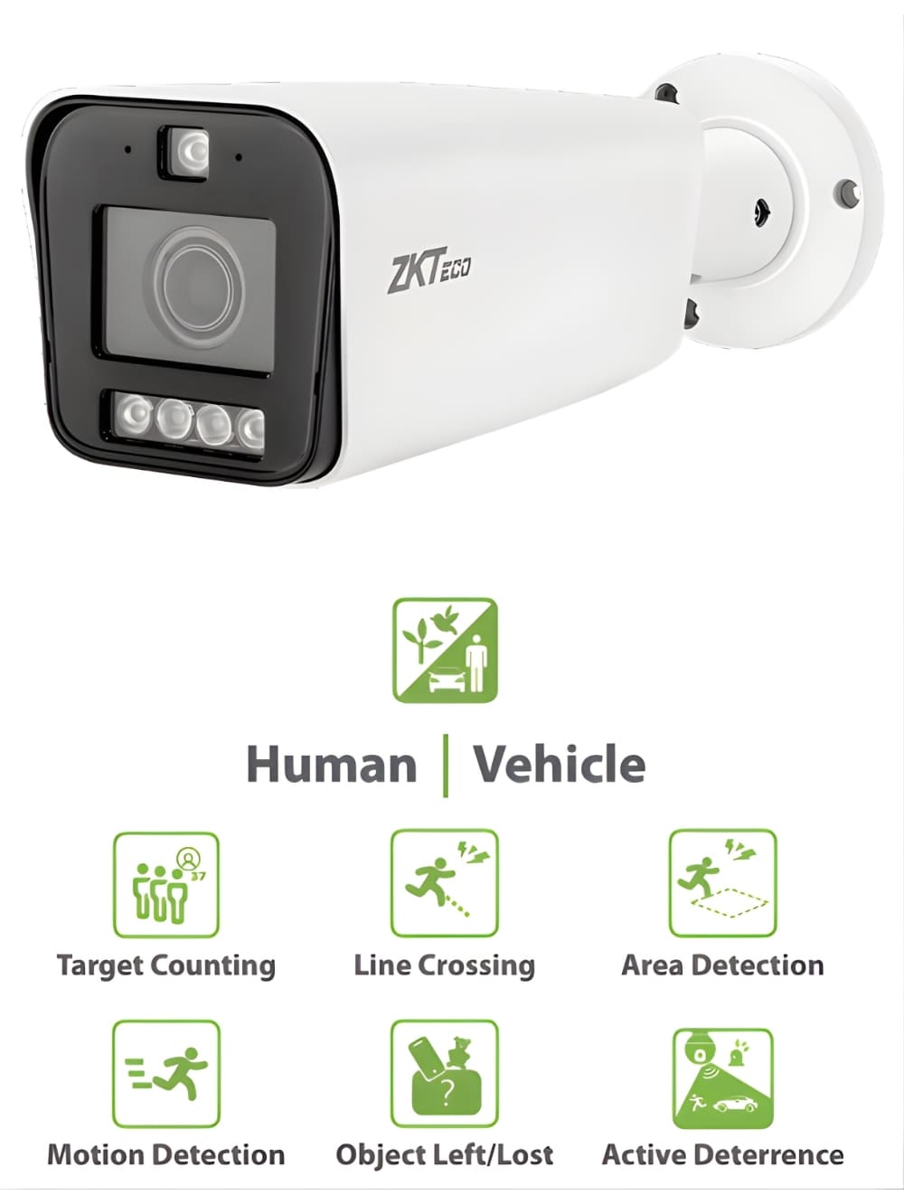 Las cámaras IP de disuasión activa de la serie ZKBio Sense son la vanguardia de la solución de videovigilancia inteligente lanzada por ZKTeco, basada en el algoritmo de aprendizaje profundo y la tecnología de visión artificial.
