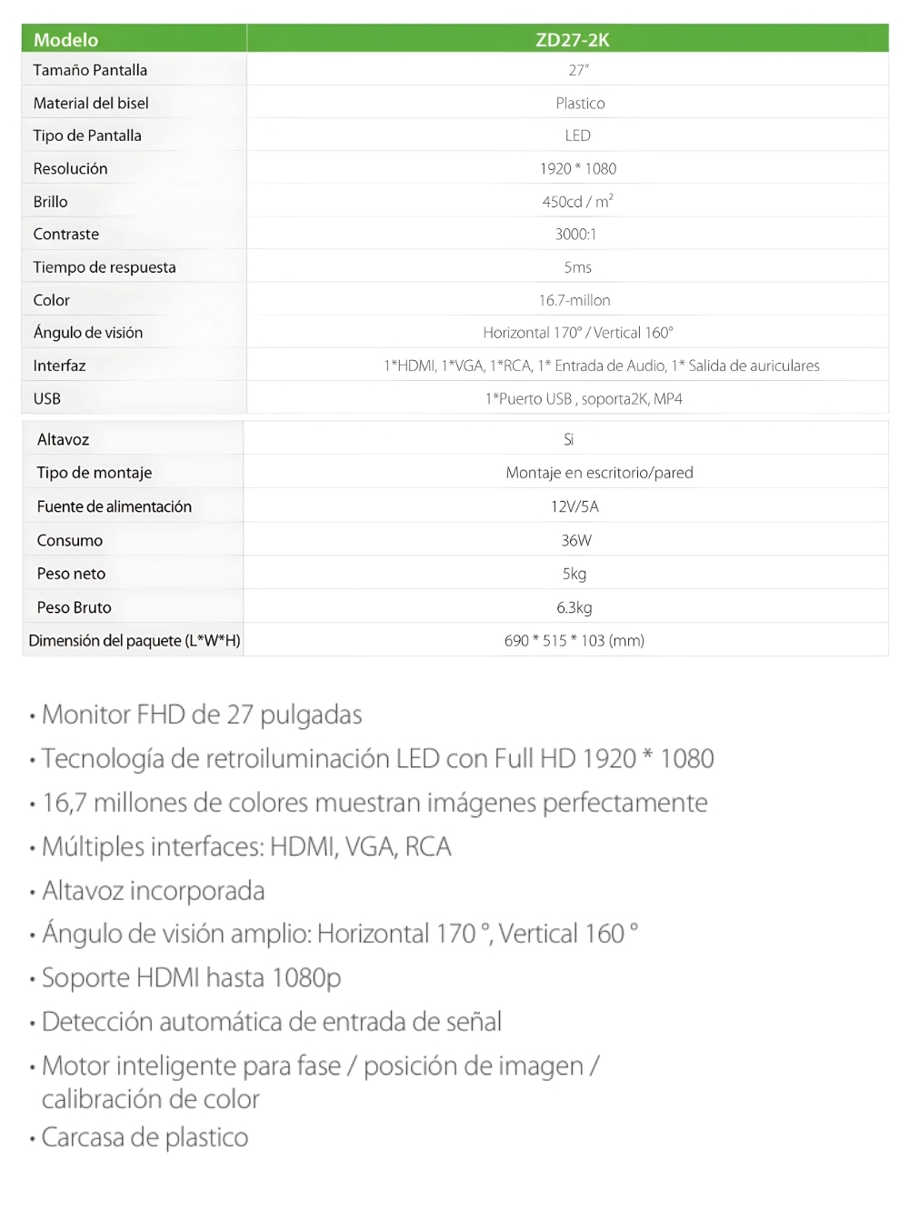 El monitor ZD27-2K tiene una pantalla de 27 pulgadas con resolucion Full HD, entrada HDMI y VGA con audio incorporado, gracias a su tecnologia de iluminacion LED, ofrece una gama de colores vividos a un bajo consumo electrico. Este equipo es compatible con montura VESA para armar un Video Wall o para un sistema basico de video vigilancia.